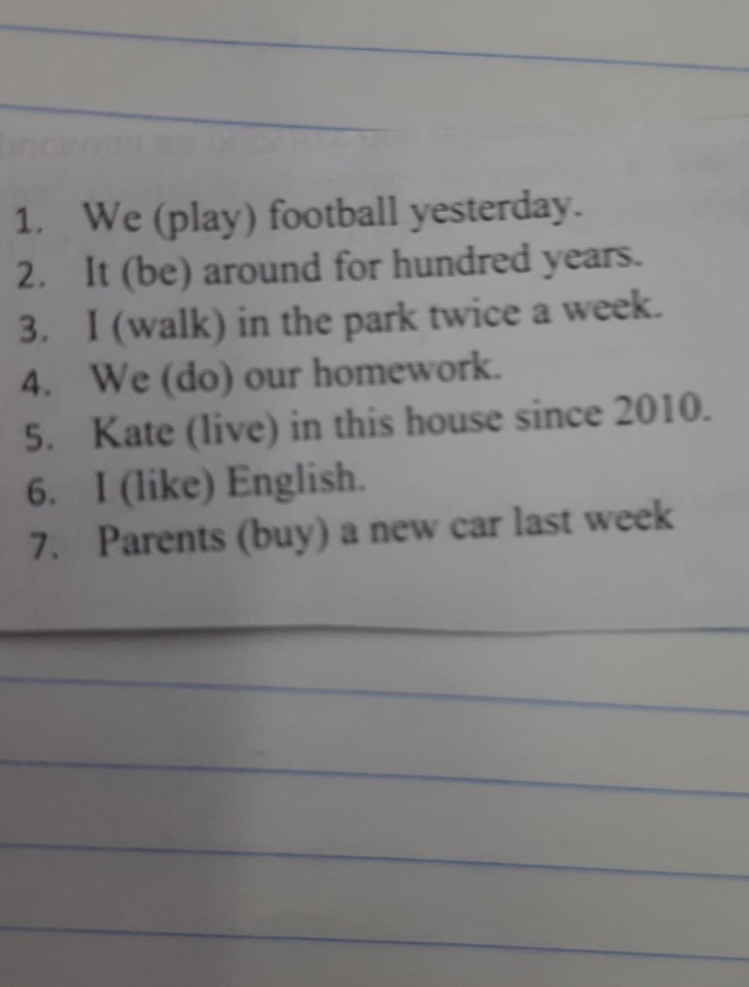 We played football yesterday. 2. It was about a hundred years old. 3. I walk in the park twice a week. 4. We are doing our homework. 5. Katya has been living in this house since 2010. 6. I like English. 7. Parents bought a new car last week