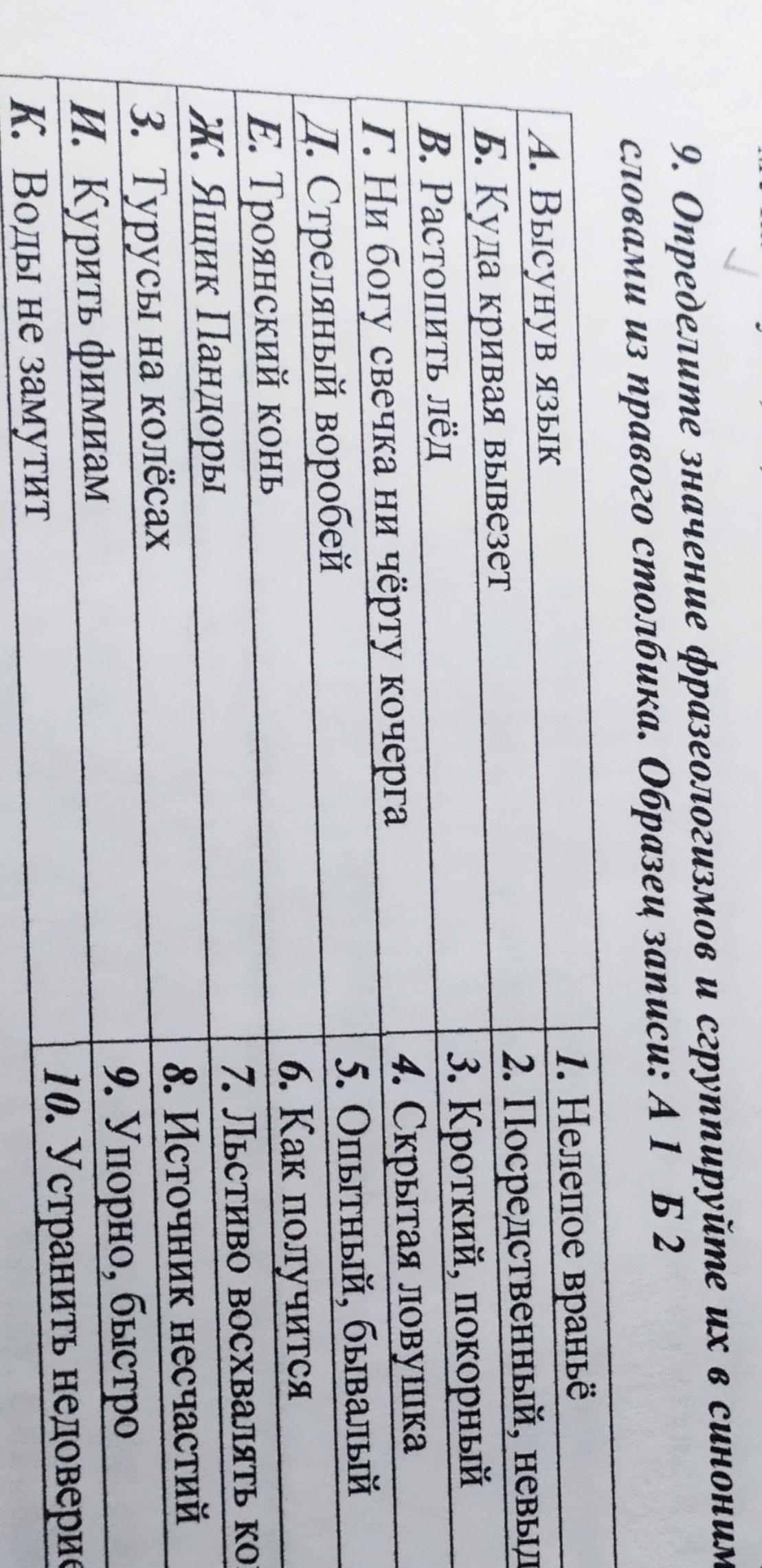 Определите значение Фразеологизмов и сгруппируйте их в синонимические пары со словами из правого столбика.