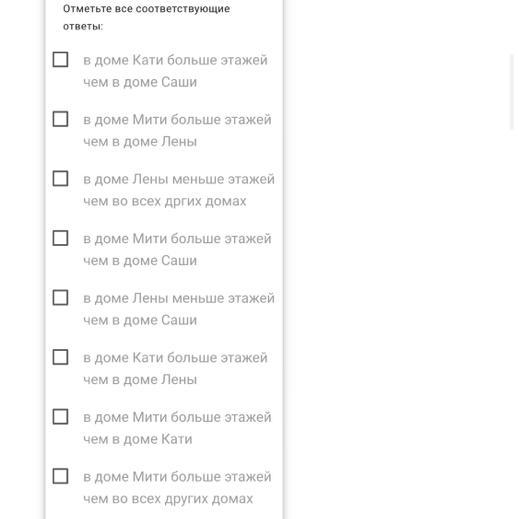 Известно что: в доме Кати меньше этажей чем в доме Мити, в доме Саши меньше этажей чем в доме Кати, в доме Саши больше этажей чем в доме Лены. Выберите утверждения, которые верны при указанных условиях