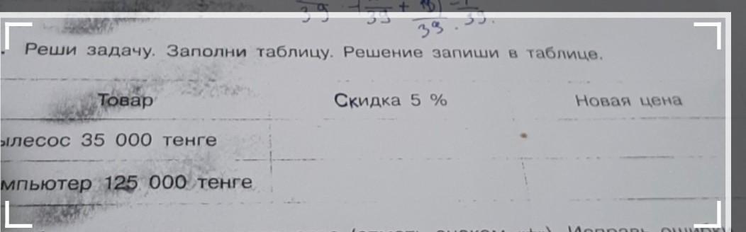 38 3 1. Реши задачу. Заполни таблицу. Решение запиши в таблице. Товар Скидка 5% % Новая цена ылесос 35 000 тенге омпьютер 125 000 тенге сос