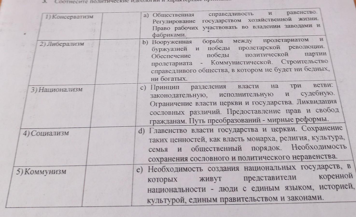 (56) Соотнесите политические идеологии и характерные признаки: и 1) Консерватизм ЖИЗНИ. и и 2) Либерализм И 3) Национализм На и а) Общественная справедливость равенство, Регулирование государством хозяйственной Право рабочих участвовать во владении заводами фабриками. b) Вооруженная борьба между пролетариатом буржуазией победы пролетарской революции. Обеспечение победы политической партии пролетариата Коммунистической. Строительство справедливого общества, в котором не будет ни бедных, ни богатых. c) Принцип разделения Власти три ветви. законодательную, исполнительную судебную. Ограничение власти церкви и государства. Ликвидация сословных различий. Предоставление прав и свобод гражданам. Путь преобразований – мирные реформы. d) Главенство власти государства и церкви. Сохранение таких ценностей, как власть монарха, религия, культура, семья общественный порядок. Необходимость сохранения сословного и политического неравенства. е) Необходимость создания национальных государств, в которых живут представители коренной национальности Люди с единым языком, историей, культурой, единым правительством и законами. - 4) Социализм и 5) Коммунизм -