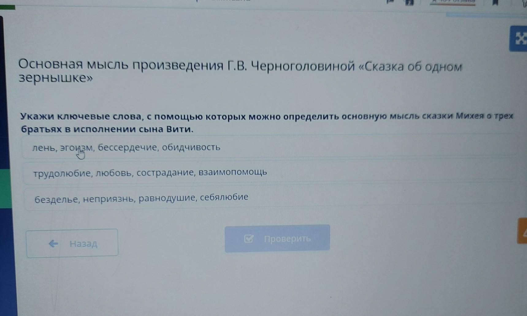 Основная мысль произведения Г.В. Черноголовиной «Сказка об одном зернышке» Укажи Ключевые слова, с помощью которых можно определить основную мысль сказки Михея о трех братьях в исполнении сына Вити. лень, эгоизм, бессердечие, обидчивость трудолюбие, любовь, сострадание, взаимопомощь безделье, неприязнь, равнодушие, себялюбие A - Назад