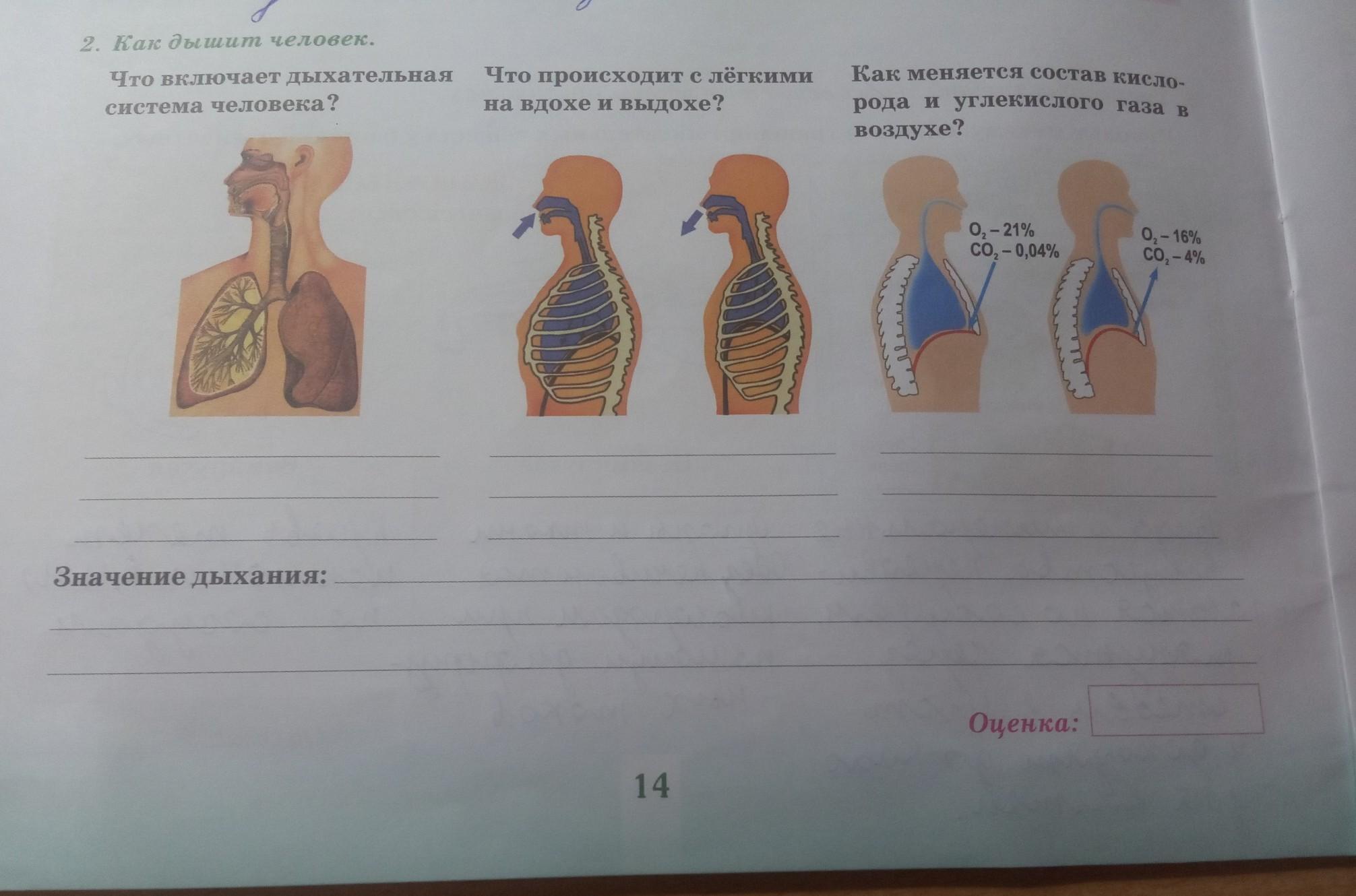 2.Вдох происходит, когда поднимается грудная клетка. При этом расширяются лёгкие, и в них поступает воздух. При выдохе, наоборот, грудная клетка сужается, сжимает лёгкие, и из них воздух выходит наружу. При вдохе воздух попадает сначала в носовую полость, где он согревается и очищается.