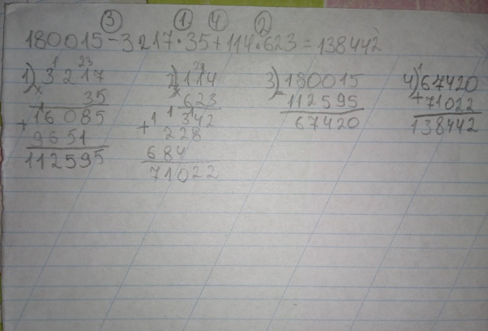 46. Вычислите значение выражения, записывая действия столбиком (5 баллов). 180 015 – 3 217 ∙ 35 + 114 ∙ 623 = 1) ________ 2) _______ 3)_______ 4)________