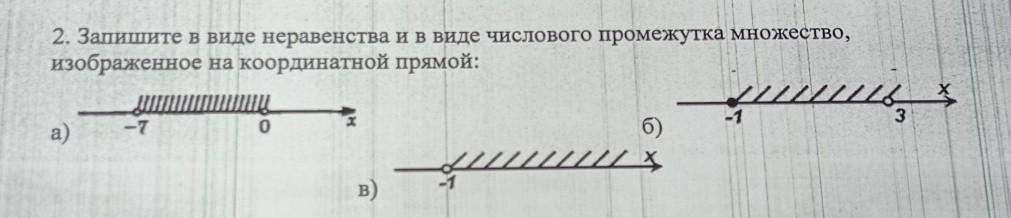 2. Запишите в виде неравенства и в виде числового промежутка множество, изображенное на координатной прямой: и ; а) -7 0 6) и ҳ в)
