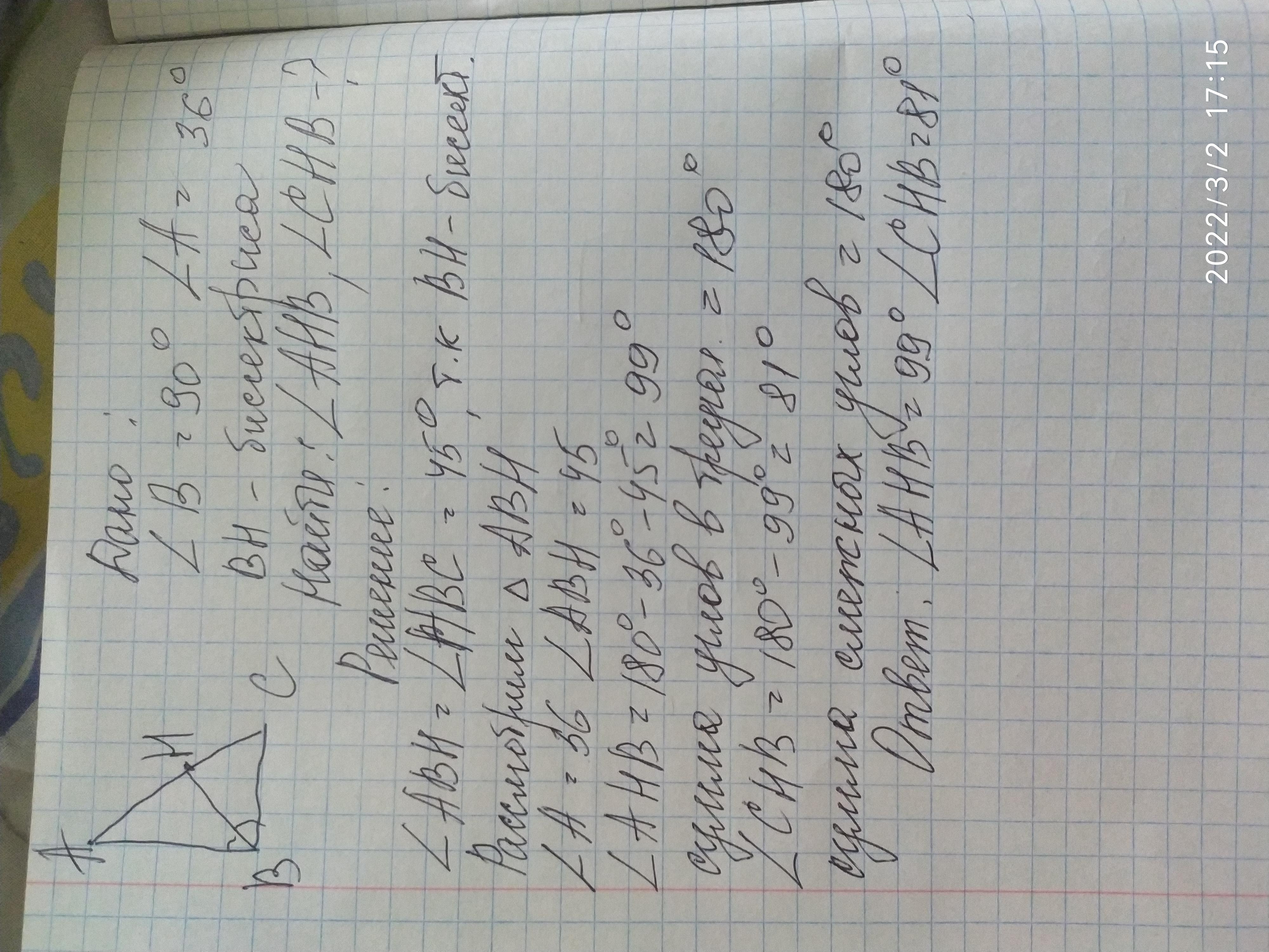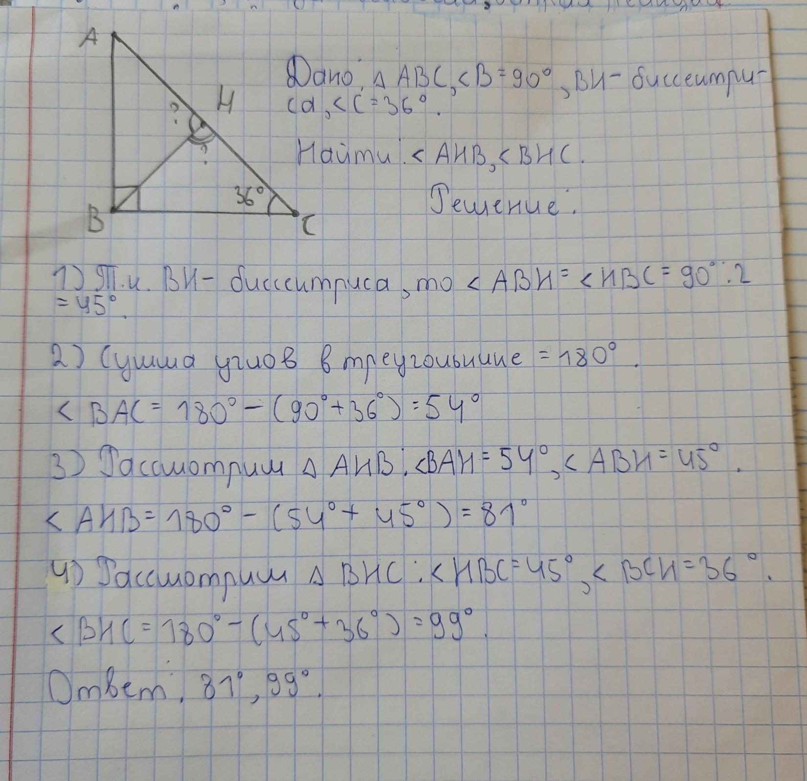 В прямоугольном треугольнике ABC ∠B=90°, BH - биссектриса. Найдите углы, которые образует биссектриса BH с гипотенузой треугольника, если один из острых углов равен 36°