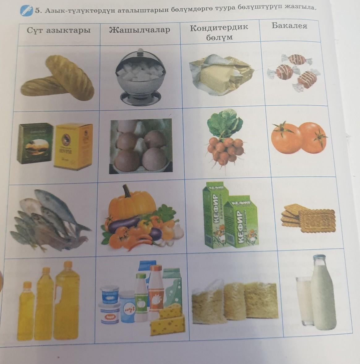 5. Азык-түлүктөрдүн аталыштарын бөлүмдөргө туура бөлүштүрүп жазгыла. Сүт азыктары Жашылчалар Бакалея Кондитердик бөлүм метр КЕФИР V КЕФИР ро) 136