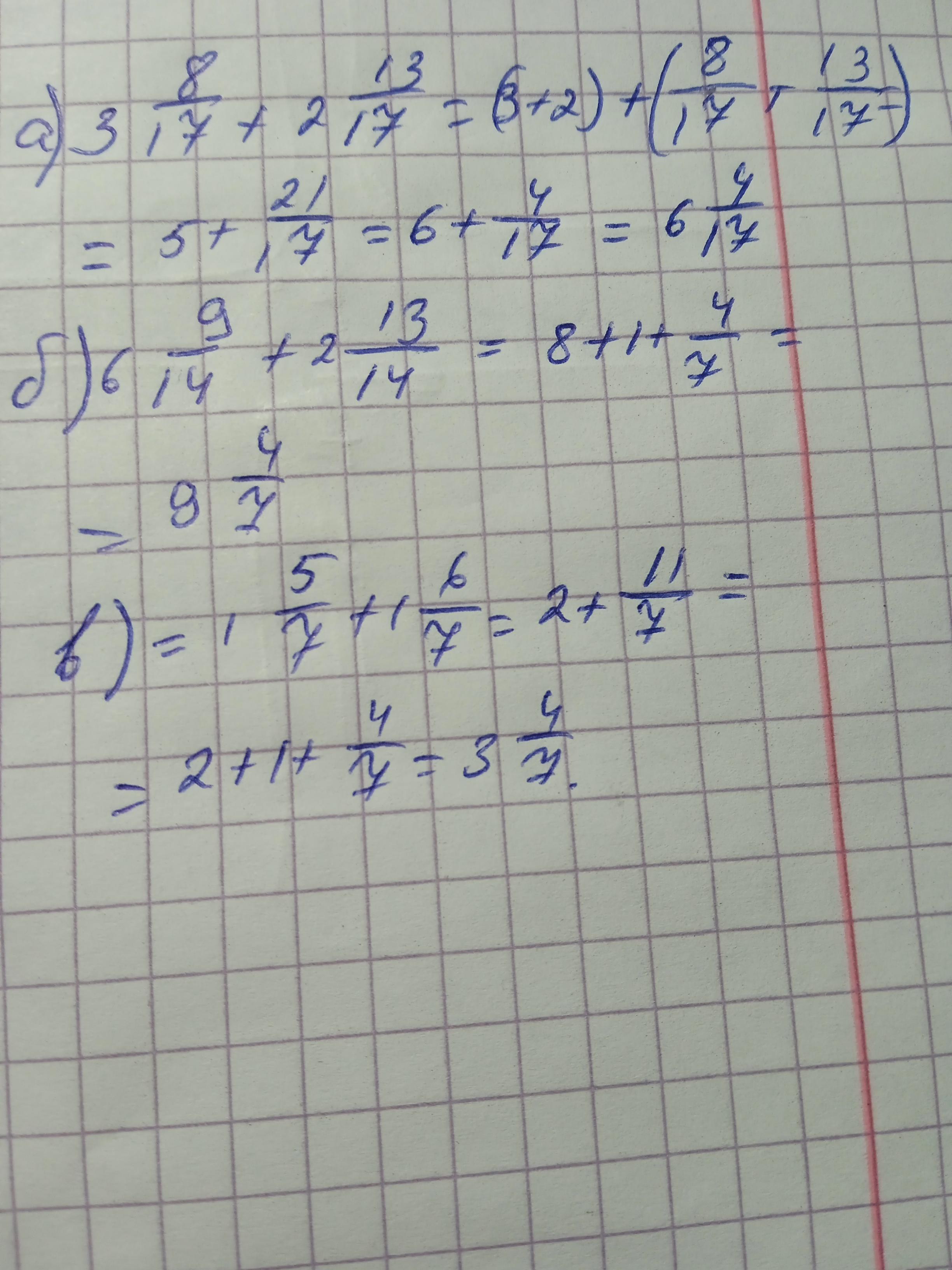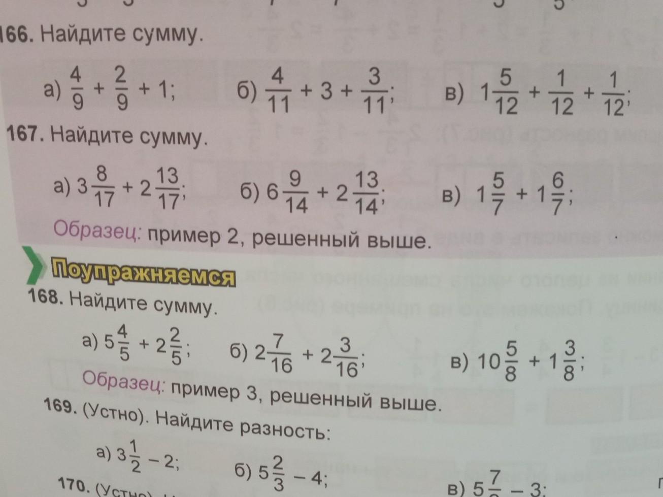 167. Найдите сумму а) 3 8/17+2 14/17 б) 6 9/14+2 13/14 в) 1 5/7+1 6/7 г) 5 7/8+3 3/8
