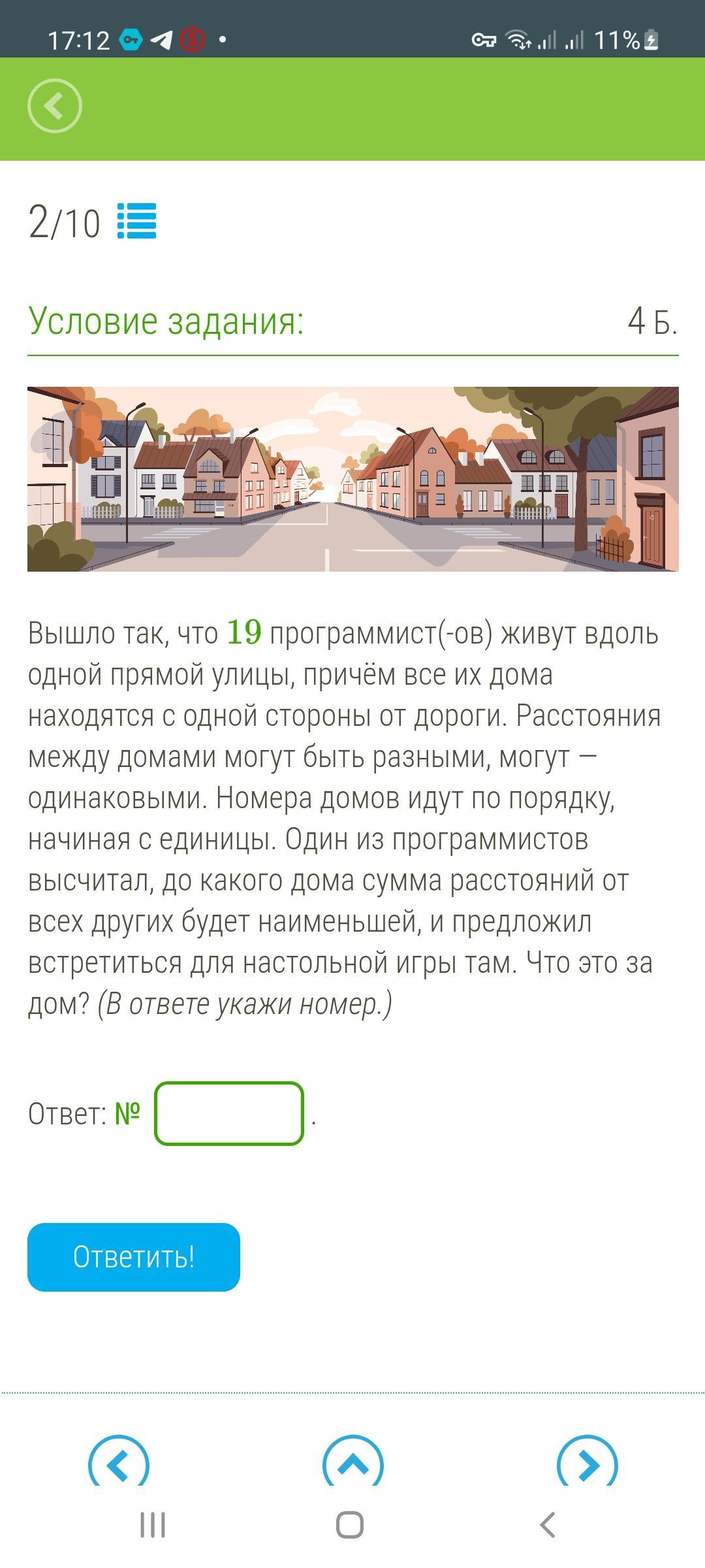 Вышло так, что 19 программист(-ов) живут вдоль одной прямой улицы, причём все их дома находятся с одной стороны от дороги. Расстояния между домами могут быть разными, могут – одинаковыми. Номера домов идут по порядку, начиная с единицы. Один из программистов высчитал, до какого дома сумма расстояний от всех других будет наименьшей, и предложил встретиться для настольной игры там. Что это за дом? (В ответе укажи номер.)