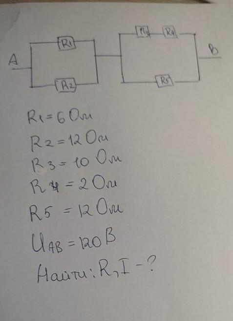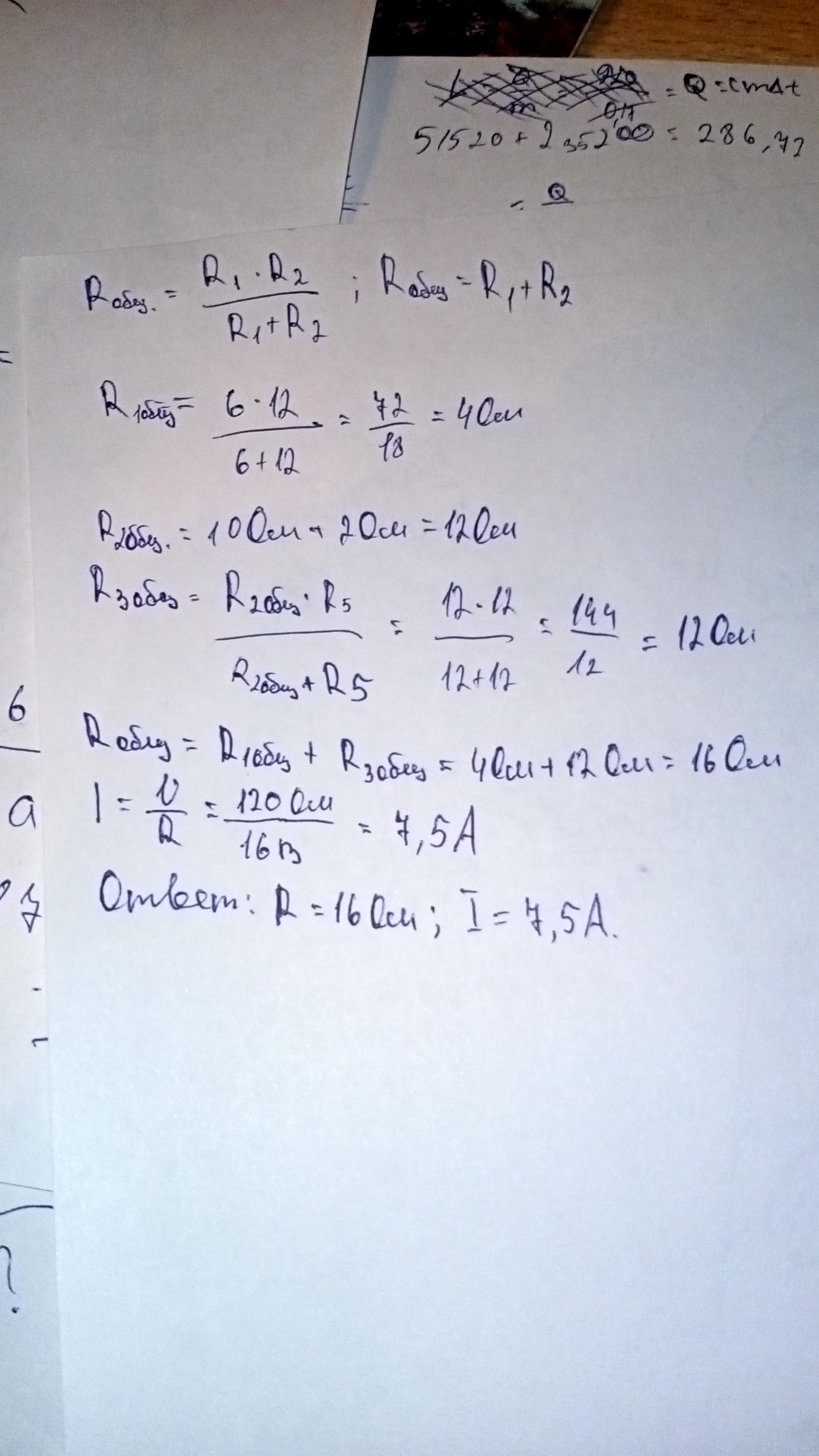 Сверху, на фотографии расписаны формулы сопротивления в параллельном и последовательном сопротивлении, с из помощью находим общее сопротивление всей цепи, чтобы легче находить общее сопротивление, я параллельное сопротивление перевел в последовательное, при помощи формул, затем по второй формуле вывел общее сопротивление. Силу тока находим по формуле I=U/R
