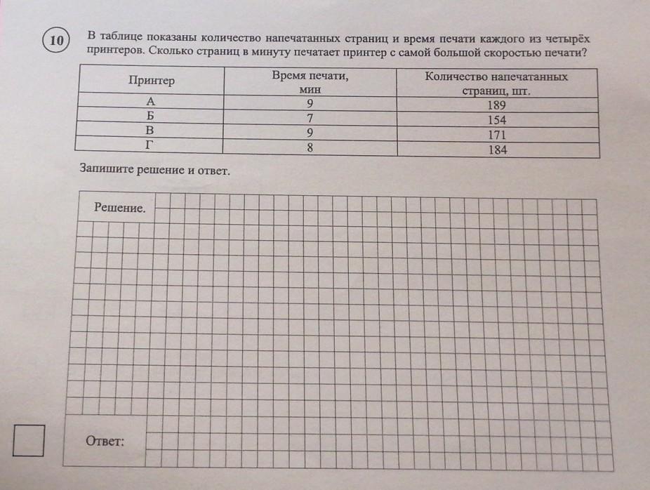 В таблице показаны количество напечатанных страниц и время печати каждого из четырёх принтеров. Сколько страниц в минуту печатает принтер с самой большой скоростью печати? Время печати, Принтер мин A Б B Г 9 7 9 8 Количество напечатанных страниц, шт. 189 154 171 184 ЗАПИШИТЕ РЕШЕНИЕ И ОТВЕЕЕТ