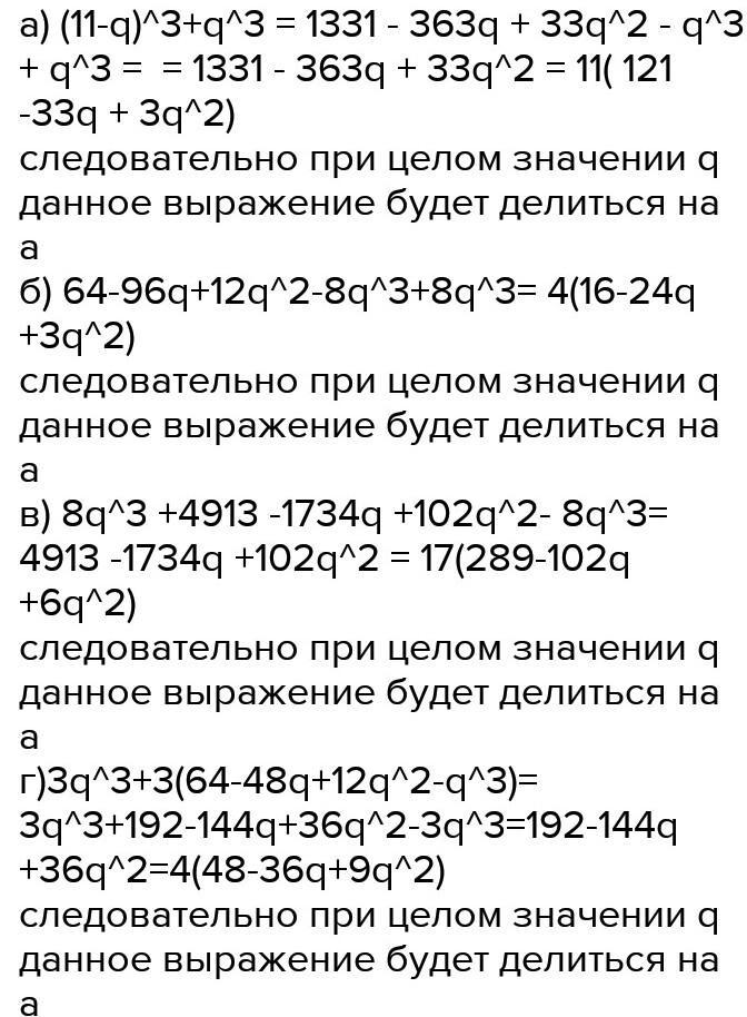 11. Докажите, что при любом целом значении q значения данне нацело делятся на а: а) (11-q) +', а = 11; б) (4 - 2q) + 84', а = 4; в) 8q' + (17-2q), а = 17; г) 34' + 3(4 - q), а=12.