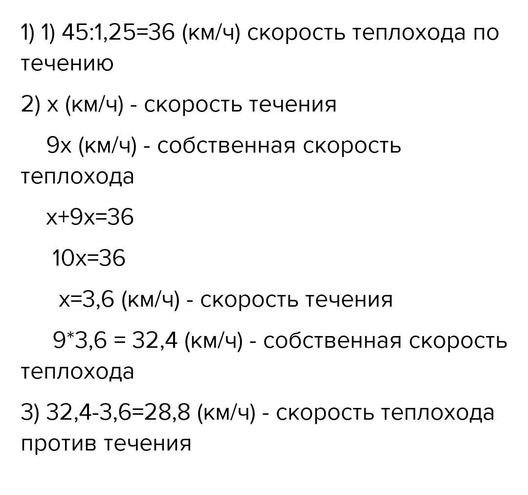 Собственная скорость теплохода в 9 раз больше, чем скорость течения реки. По течению теплоход проходит 45 км за 1 ч,15 мин. Найдите скорость теплохода против течения реки.