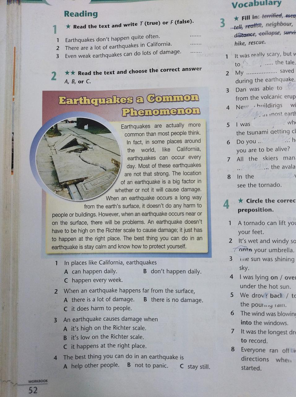 In places like California, earthquakes A can happen daily. C C happen every week. B don't happen daily. 2 When an earthquake happens far from the surface, A there is a lot of damage. B there is no damage. C it does harm to people. C 3 An earthquake causes damage when A it's high on the Richter scale. B it's low on the Richter scale. C it happens at the right place. 4 The best thing you can do in a