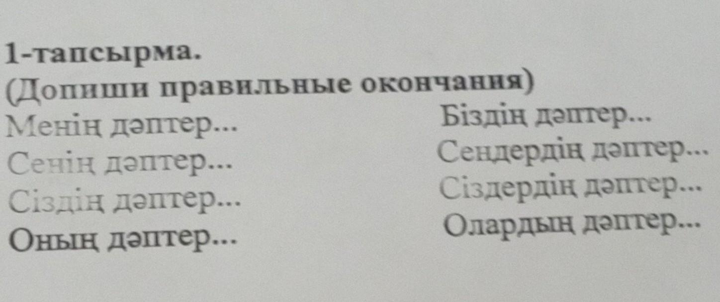 1-тапсырма. Біздің дәптер... Сендердің дәптер... Сiздердiң дәптер... Олардың дәптер... Оның дәптер... Сіздің дәптер... Сенің дәптер... (Допиши правильные окончания) Менің дәптер...