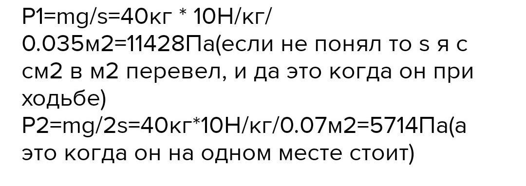 P1=mg/s=40кг * 10H/кг/0.035м2=11428Па(если не понял то s я с см2 в м2 перевел, и да это когда он при ходьбе)