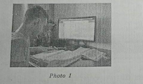 The picture shows a guy who is sitting next to the computer. Perhaps he is reading a book, or doing homework. He has a lot of books and sheets on his desk. He is sitting in a bright room. The book is big. There is a flower nearby. He has already read a lot. preparing for lessons