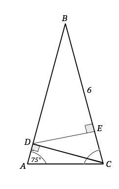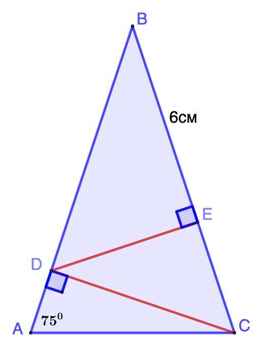 В равнобедренном треугольнике ABC с основанием AC угол A составляет 75 градусов, их угла С построен перпендикуляр СD к противолежащей стороне, точка D лежит на стороне AB. Из точки D построен перпендикуляр DE к стороне BC, точка Е лежит на стороне ВС. Известно, что отрезок ВЕ равен 6 см. Найди боковую сторону треугольника