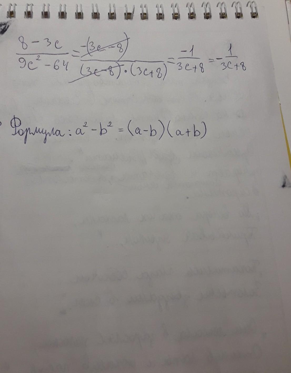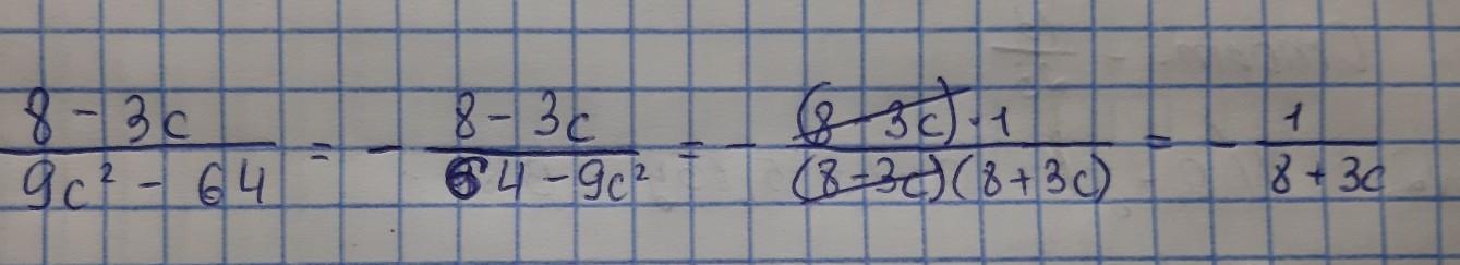 т.к. просто разложить по формуле знаменатель да так, чтобы подошли числа, сразу не получится, то мы меняем знаки в знаменателе у слагаемых, т.е. перед дробью ставим знак минус, переписываем числитель, а в знаменателе вместо -64 и 9с², получаем обратные им слагаемые 64 и -9с². тут уже все отлично раскладывается, главное - сокращать дробь можно только если есть умножение. никакого сложения быть не должно!