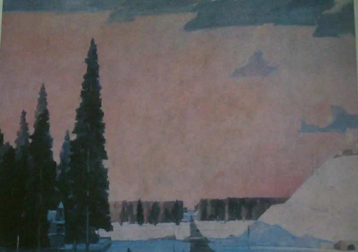 На этой картине мы первым делом видем елки. Небо немного розовое. Такое ощущение, что скоро наступит весна. Видно что это глубокая зима. Снега очень много, что даже образовался большой холм. В дали мы тоже видим деревья. Художник использовал тёплые оттенки.