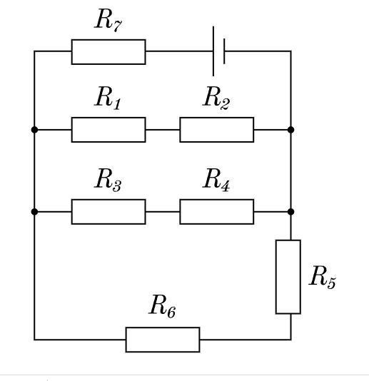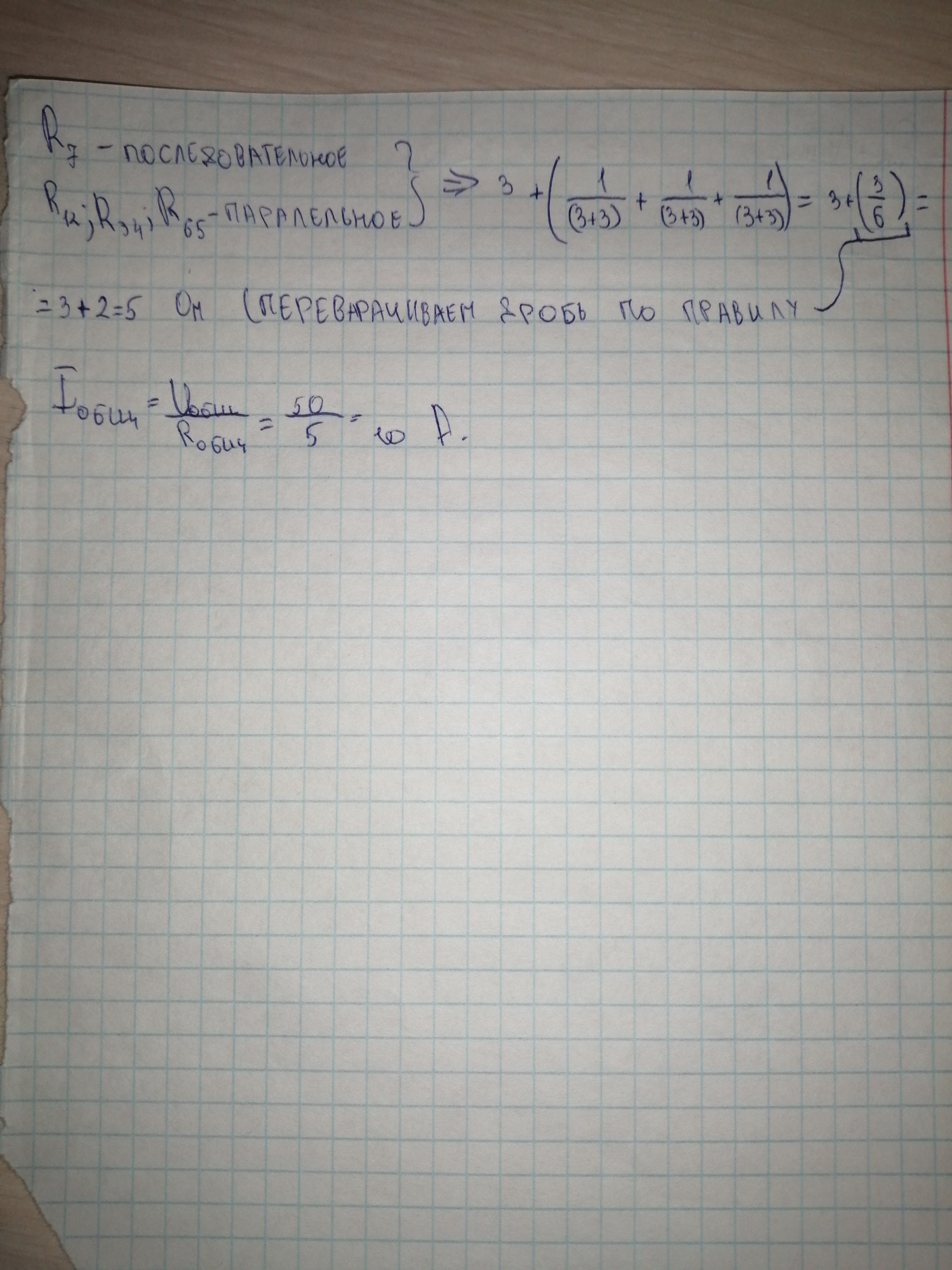 Общее напряжение в цепи, изображённой на схеме, равно 50 В . Сопротивление каждого из резисторов — 3 Ом . Чему равна общая сила тока в цепи?