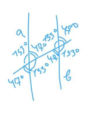 ∠ в 133° и ∠у - внутренние односторонние углы при параллельных прямых a и b и секущей с ⇒ ∠у=180°-133°=47° (по свойству ║ прямых)