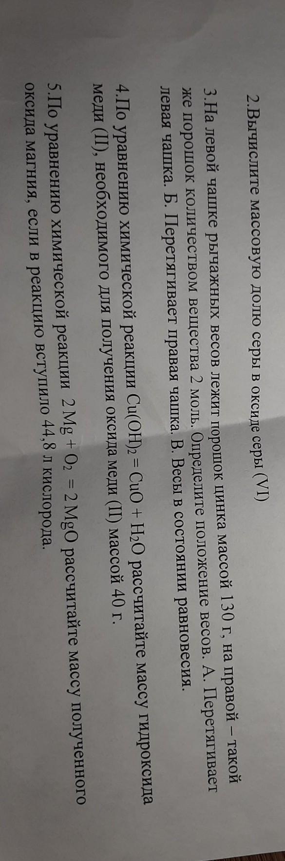 2.Вычислите массовую долю серы в оксиде серы (VI) 3. На левой чашке рычажных весов лежит порошок цинка массой 130 г, на правой — такой же порошок количеством вещества 2 моль. Определите положение весов. А. Перетягивает левая чашка. Б. Перетягивает правая чашка В. Весы в состоянии равновесия. 4.По уравнению химической реакции Cu(OH) = CuO + H2O рассчитайте массу гидроксида меди (II), необходимого для получения оксида меди (ІІ) массой 40 г. 5.По уравнению химической реакции 2 Mg + O2 = 2 MgO рассчитайте массу полученного оксида магния, если в реакцию вступило 44,8 л кислорода.