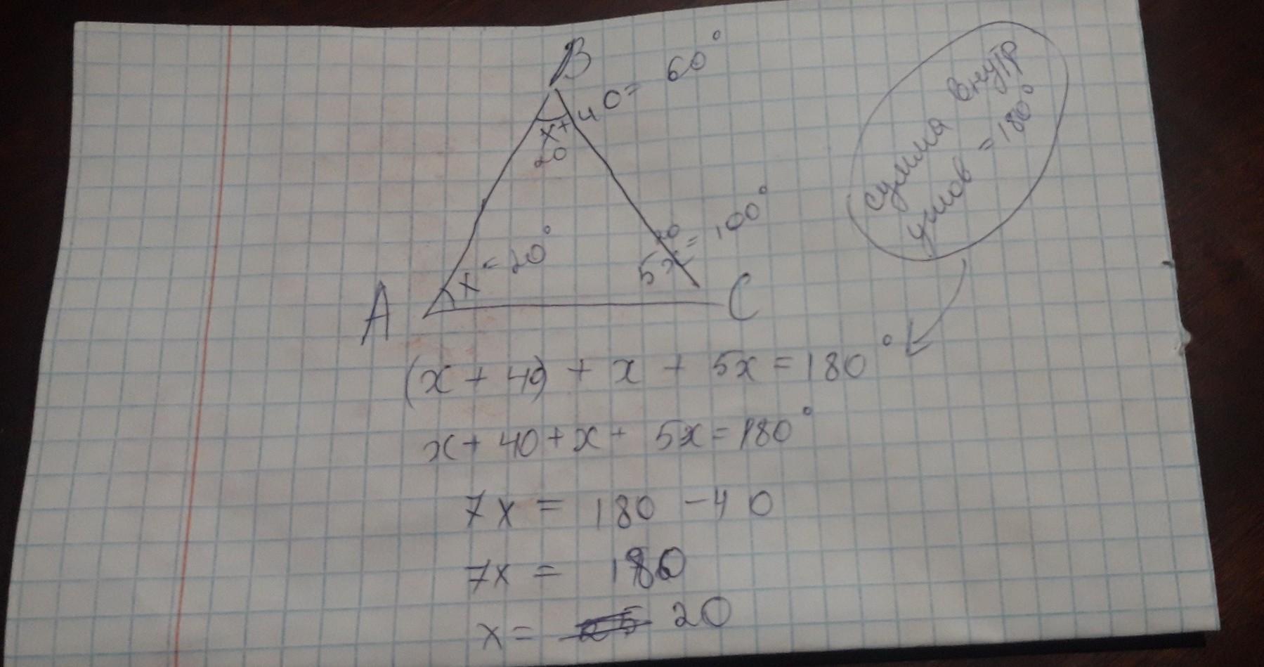 Объяснение: Пусть <А=х. Тогда <В=х+40,а <С=5х. По теореме суммы < тр-ка сумма углов треугольника ABC =180 градусам. Составим уравнение.