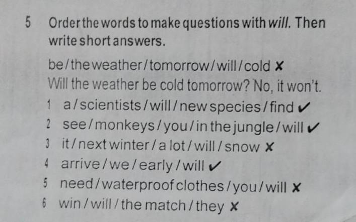 1)1Will a scientist find new species?Yes,he will.2)will you see monkeys in the jungle?yes,i will.3)will it snow a lot new winter?No,it won't.4)Will we arrive early?yes,we will.5)will u need waterproof clothes?No,i won't.6)Will they win a match?No they won't