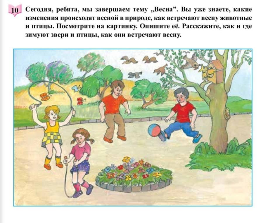 На картинке изображены дети,которые играют друг с другом.Девочки друг с другом,а мальчики между собой.Они в большом парке,рядом цветы,деревья.Рядом степь,птички сидят в скворечниках,некоторые летают.Птицы улетаю в теплые края,а звери впадают в спячку.У них у всех есть внутренние биологические часы:они всегда знают, когда наступает весна,и нужно возвращаться домой.Птицы радостно поют,а звери выкладывают яйца.