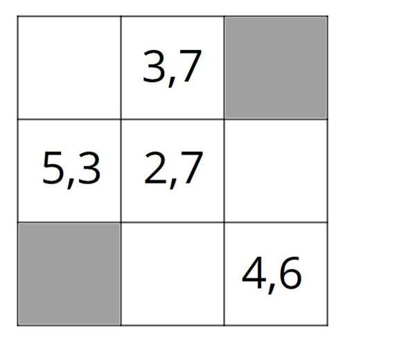 Таблица 3х3 была заполнена числами. Часть чисел была стёрта, но несколько чисел уцелели. Маша знает, что таблица была заполнена так, что суммы чисел в любой горизонтали или вертикали принимают одно и то же значение, но какое — неизвестно. Маше необходимо назвать сумму чисел, записанных в выделенных Клетках. Чему равна эта сумма? 12 бала