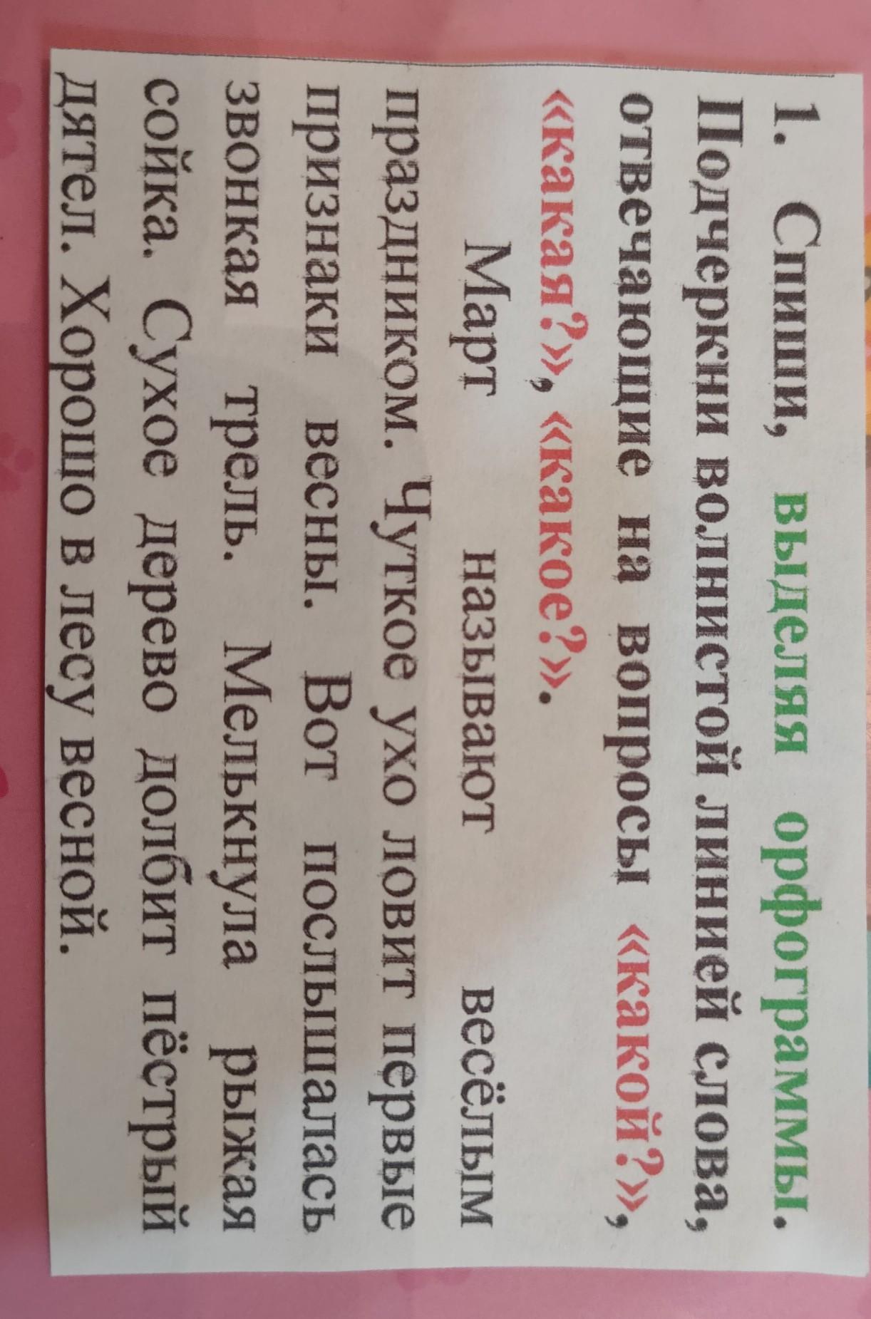 1. Спиши, выделяя орфограммы. Подчеркни волнистой линией слова, отвечающие на вопросы «какой?», «какая?», «какое?».
