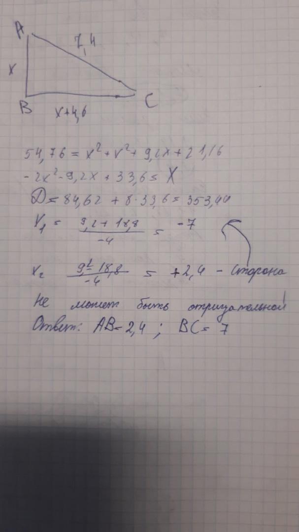 длины катетов прямоугольного треугольника различаются на 4,6 см а длина гипотенузы равна 7,4 см. найдите длины катетов.( помогите пожалуйста)