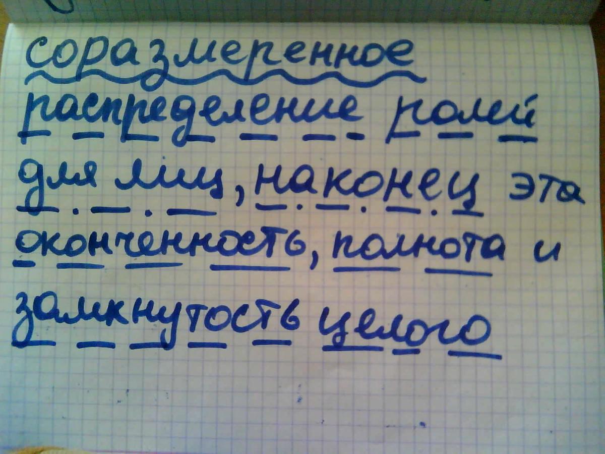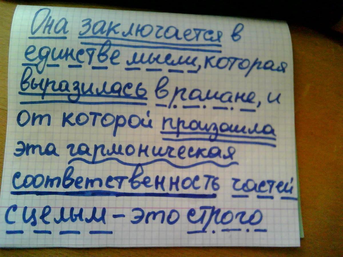 Она заключается в единстве мысли , которая выразилась в романе, и от которой произошла эта гармоническая соответственность частей с целым- это строго соразмеренное распределение ролей для все лиц, наконец эта оконченность, полнота и замкнутость целого... (синтаксический разбор)