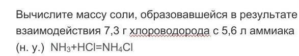Вычислите массу соли, образовавшейся в результате взаимодействия 7,3 г хлороводорода с 5,6 л аммиака (н. у.) NH3+HCl=NH4Cl Решите задачу на избыток – недостаток