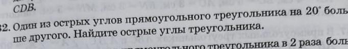 Ответ: по правилу сумма острых углов в прямоугольном треугольнике равна 90 градусам. 90-20=70 70:2=35 (меньший остры угол) 35+20=55 (больший острый угол) Ответ: 35;55;90.