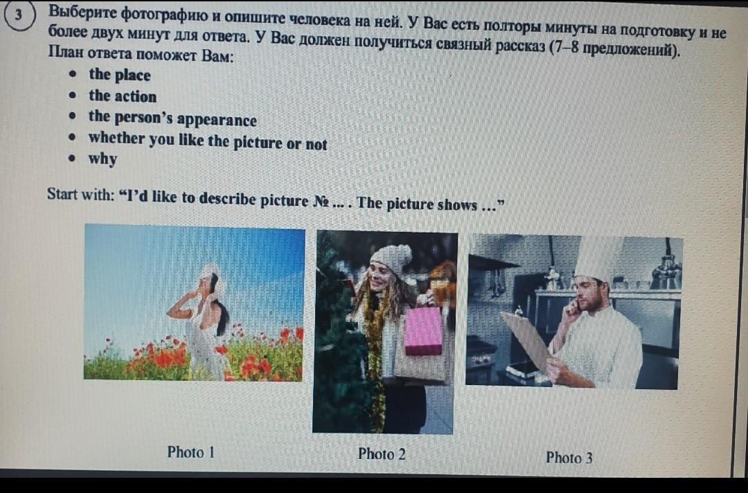 Выберите фотографию и опишите человека на ней. У Вас есть полторы минуты на подготовку и не более двух минут для ответа. У Вас должен получиться связный рассказ (7-8 предложений). План ответа поможет Вам: . the place . the action • the person's appearance . whether you like the picture or not . why Start with: "I'd like to describe picture N.... The picture shows ...."