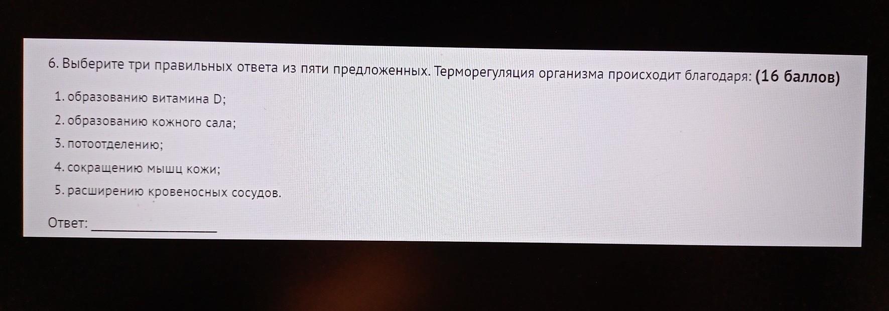 3. Выберите три правильных ответа из пяти предложенных. Терморегуляция организма происходит благодаря:
