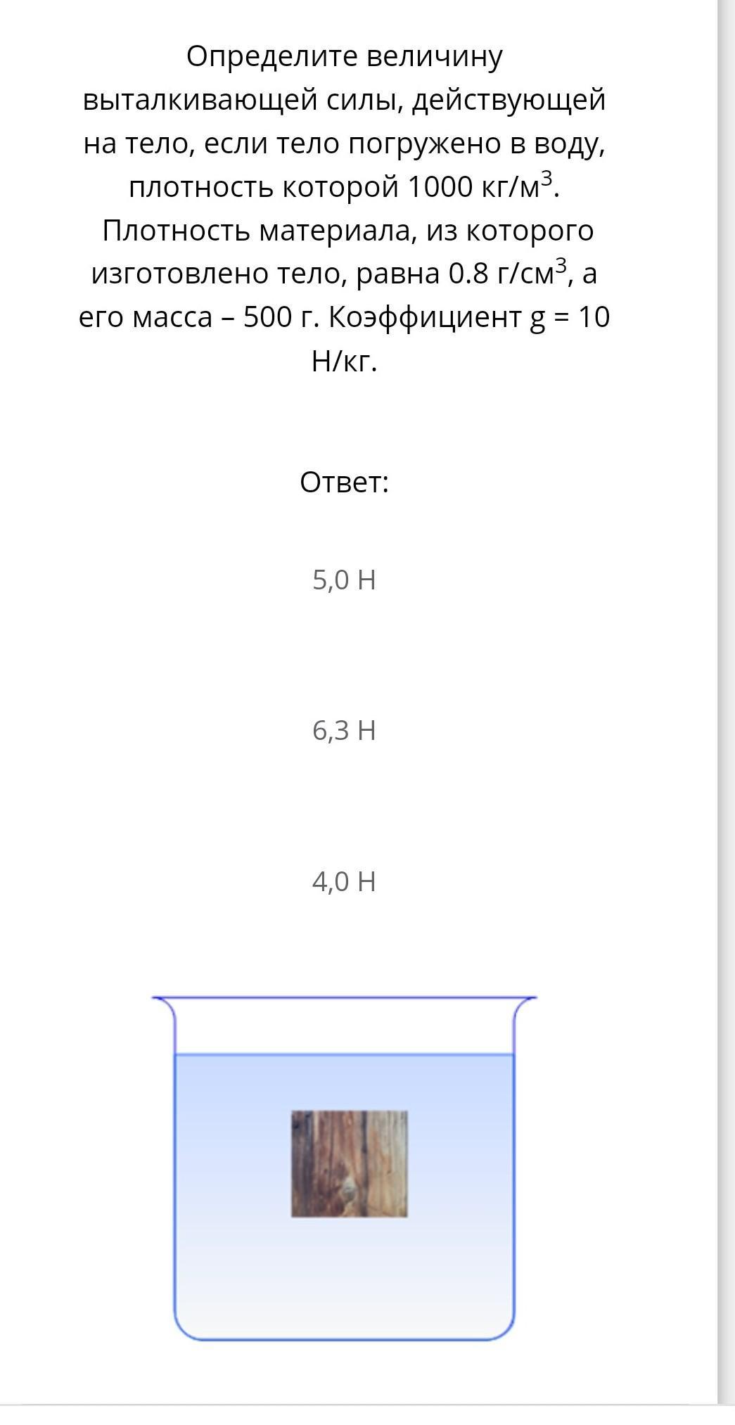 Fₐ = ρ₁·g·V = 1000·10·0,63·10⁻³ = 6,3 Н
