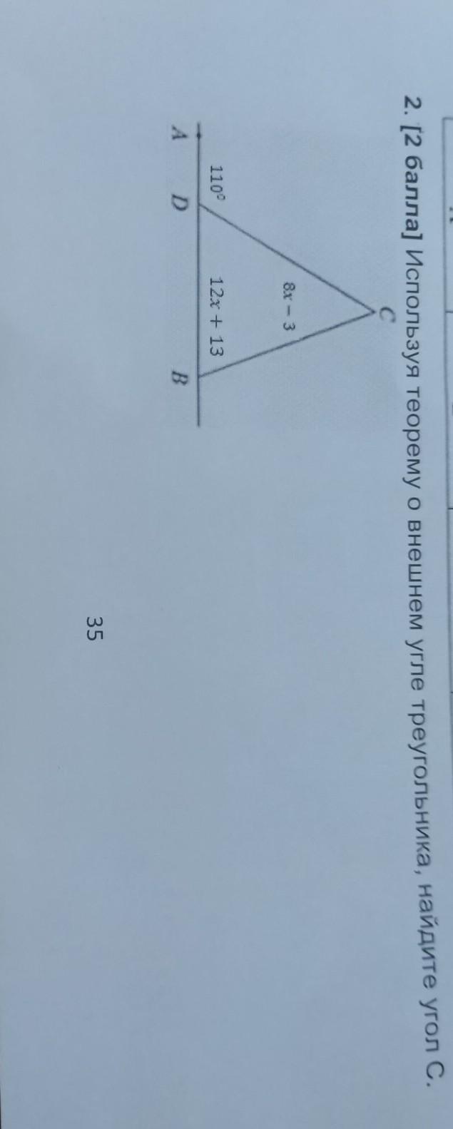 [2 балла] Используя теорему о внешнем угле треугольника, найдите угол С. с 8x - 3 110° 12x + 13 D B,СРОЧНОООО