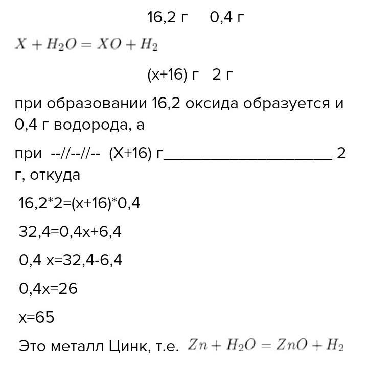 При взаимодействии неизвестного металла с водяным паром образуется его двухвалентный оксид. Масса образовавшегося оксида 16,2 г, масса водорода 0,4 г. Определите, какой металл взаимодействует с водой.