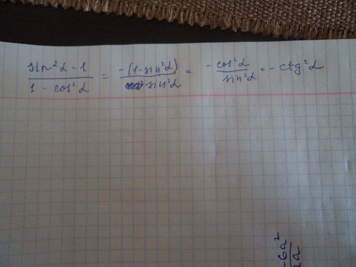 (sin^2a-1)/(1-cos^2a)=-cos^2a/sin^2a=-ctg^2a