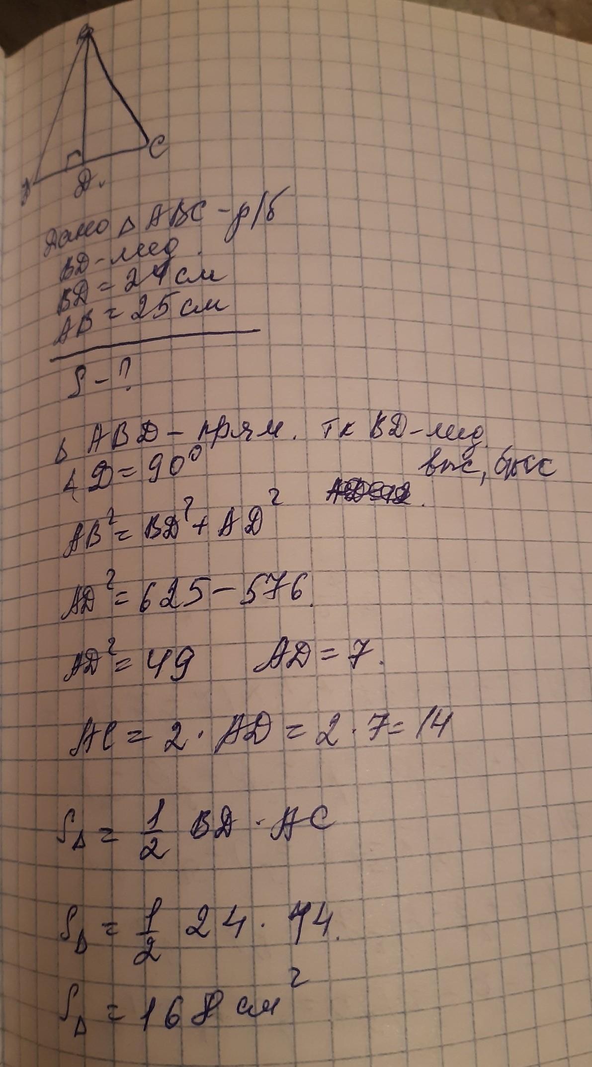 боковая сторона равна 25см. Найдите площадь данного треугольника.