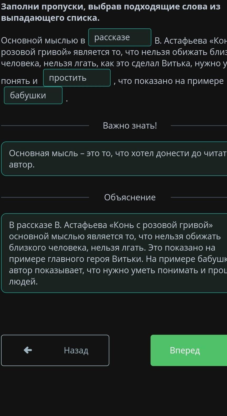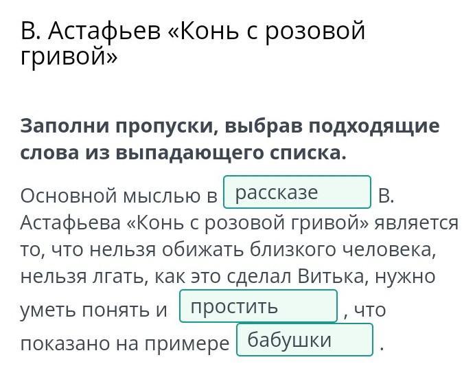 Основной мыслью в ₙ В. Астафьева «Конь с розовой гривой» является то, что нельзя обижать близкого человека, нельзя лгать, как это сделал Витька, нужно уметь понять и ₙ , что показано на примере ₙ .