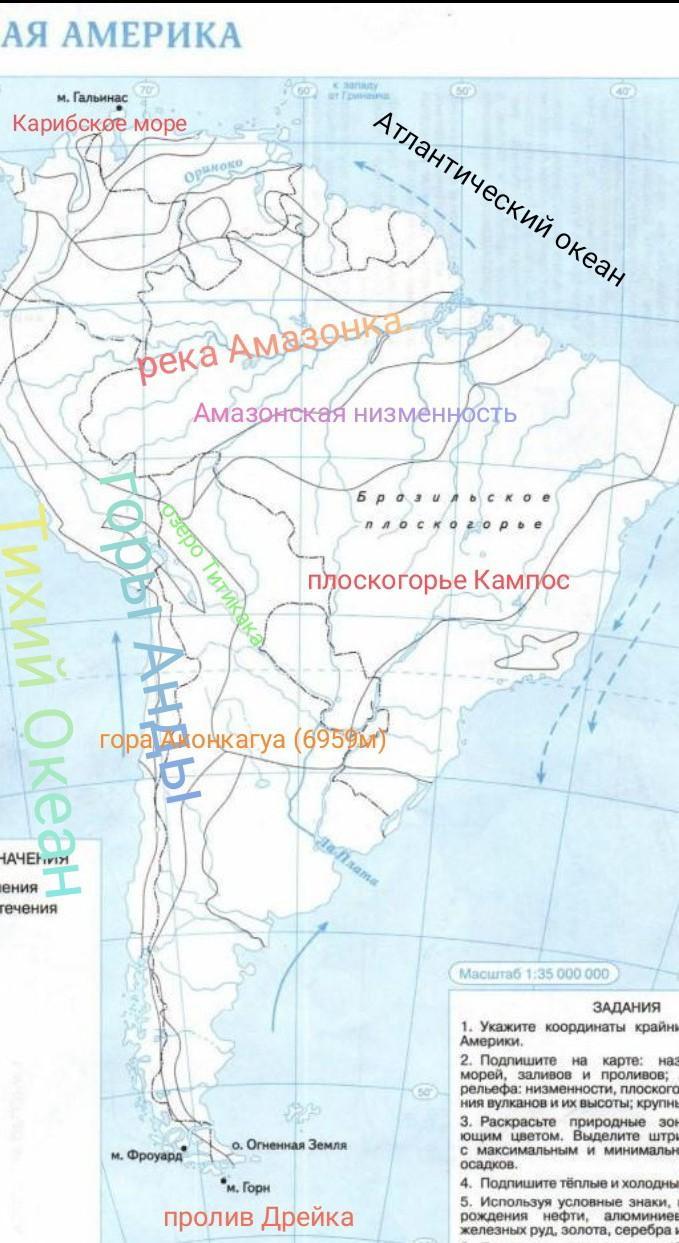 подпишите на карте названия океанов морей заливов и проливов; крупные формы рельефа низменности равнины горы названия вулканов и их высоты крупные реки озёра