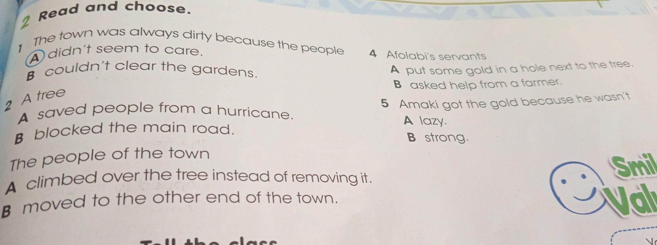 2 Read and choose. 1 The town was always dirty because the people A didn't seem to care. B couldn't clear the gardens. 4 Afolabi's servants A put some gold in a hole next to the tree. Basked help from a farmer 5 Amaki got the gold because he wasn't 2 A free A lazy. B strong. A saved people from a hurricane. B blocked the main road. The people of the town A climbed over the tree instead of removing it. B moved to the other end of the town. 3 Smiles obves!