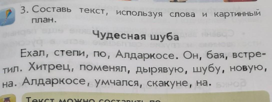 3. Составь текст, используя слова и картинный План. Чудесная шуба Ехал, степи, по, Алдаркосе. Он, бая, встре- тил. Хитрец, поменял, дырявую, шубу, новую, на. Алдаркосе, умчался, скакуне, на. 1класс