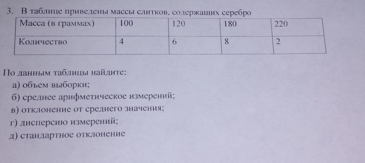в таблице приведены масса средства содержащие Серебро по данным таблицы Найдите объем выборки средне арифметическое измерения в отклонение среднего значения дисперсию измерения стандартное отклонение дайте ответ