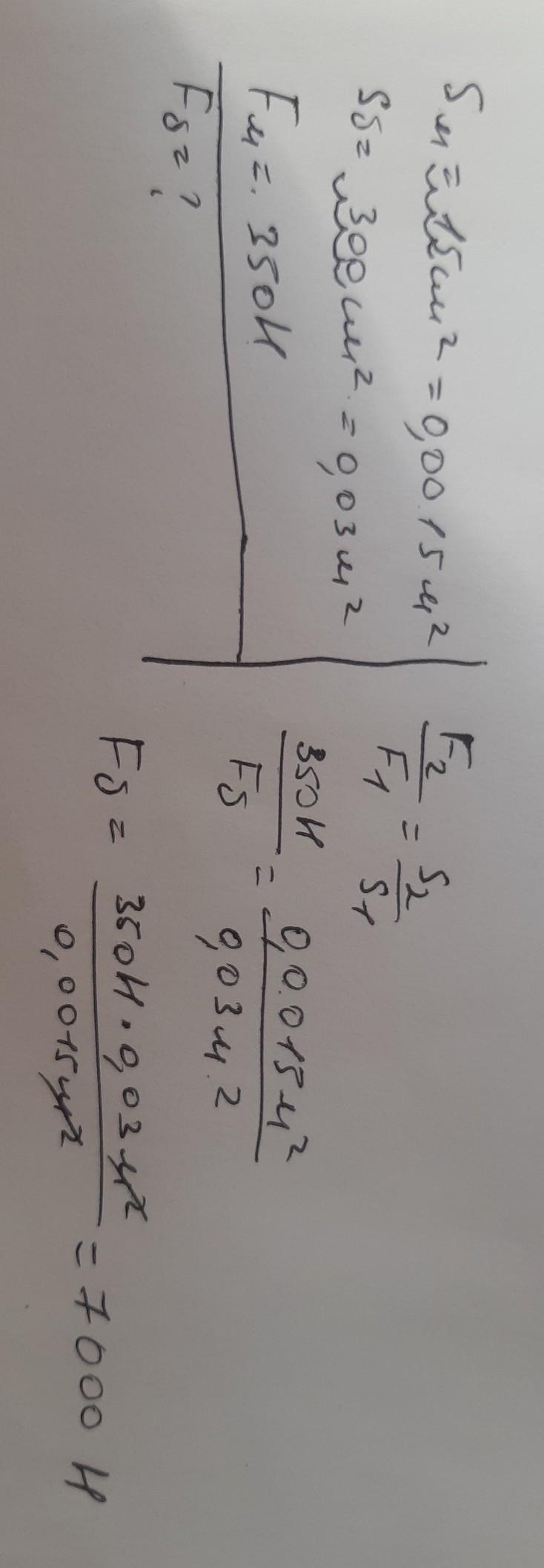 СРОЧНО ПОЛНОЕ РЕШЕНИЕ И ОФОРМЛЕНИЕ 5. Площадь меньшего поршня гидравлического пресса 15cм² площадь большего поршня 300cм² На меньший поршень действует сила 350 Н. Какая сила-действует на больший [