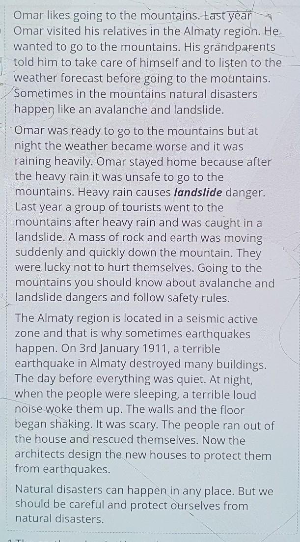 Natural Disasters in Kazakhstan Read the text and mark the statements True or False. 1) Text E o 1. The earthquakes in Almaty happen because of its location in a seismic active zone. 2.When the earthquake happened the houses started shaking 3.During the earthquake in 1911 in Almaty people couldn't save themselves.